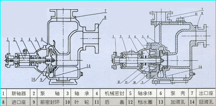 在一些泵的軸承體底部還設有冷卻室。當軸承發(fā)熱引起軸承體溫升超過70℃時,可在冷卻室外通過 一只冷卻液管接頭,注入冷卻液循環(huán)冷卻。泵內(nèi)部防止液體由高壓區(qū)向低壓區(qū)泄漏的密封機構是前 后密封環(huán),前密封環(huán)裝在泵體上,后密封環(huán)裝在軸承體上,當泵經(jīng)長期運轉密封環(huán)磨損到一定程度,并 影響到泵的效率和自吸性能時,應給予更換。
