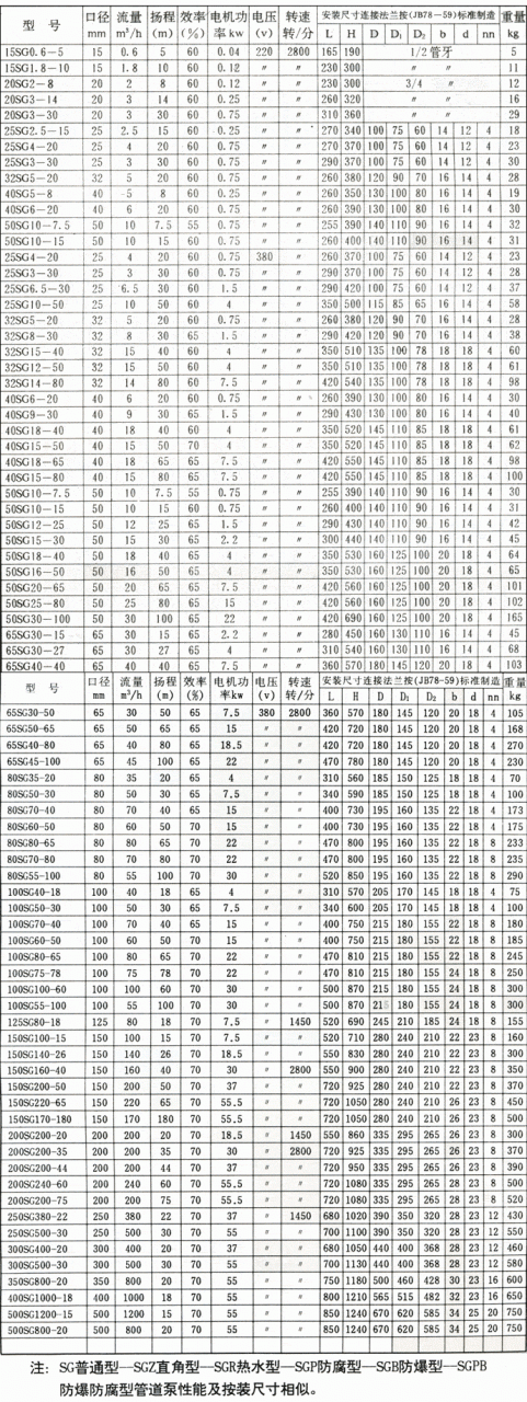 (1)SG普通型適用于高層建筑增壓送水,園林噴灌、冷卻塔上水、遠距離輸水、制冷沖洗,浴室等冷暖水循環(huán)加壓。使用溫度80℃以下。