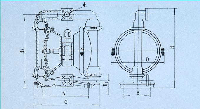 圖1:空氣經(jīng)由氣閥壓縮進(jìn)入膜片A之背面,由膜片擠壓液室。此種以空氣驅(qū)動(dòng)的方式可免除一般活塞驅(qū)動(dòng)之機(jī)械應(yīng)力,從而顯著地延長膜片的壽命。在壓縮空氣將膜片A推離中心體時(shí),另一端之膜片B同時(shí)被連結(jié)之中心軸拉向中心體,此時(shí),膜片B背面之空氣由出口排放到泵體外。如此使B室形成真空狀態(tài),因而能靠外面大氣壓力之作用將流體由入口支管將閥球推離閥座使流體能自由地進(jìn)入B室直至填滿。